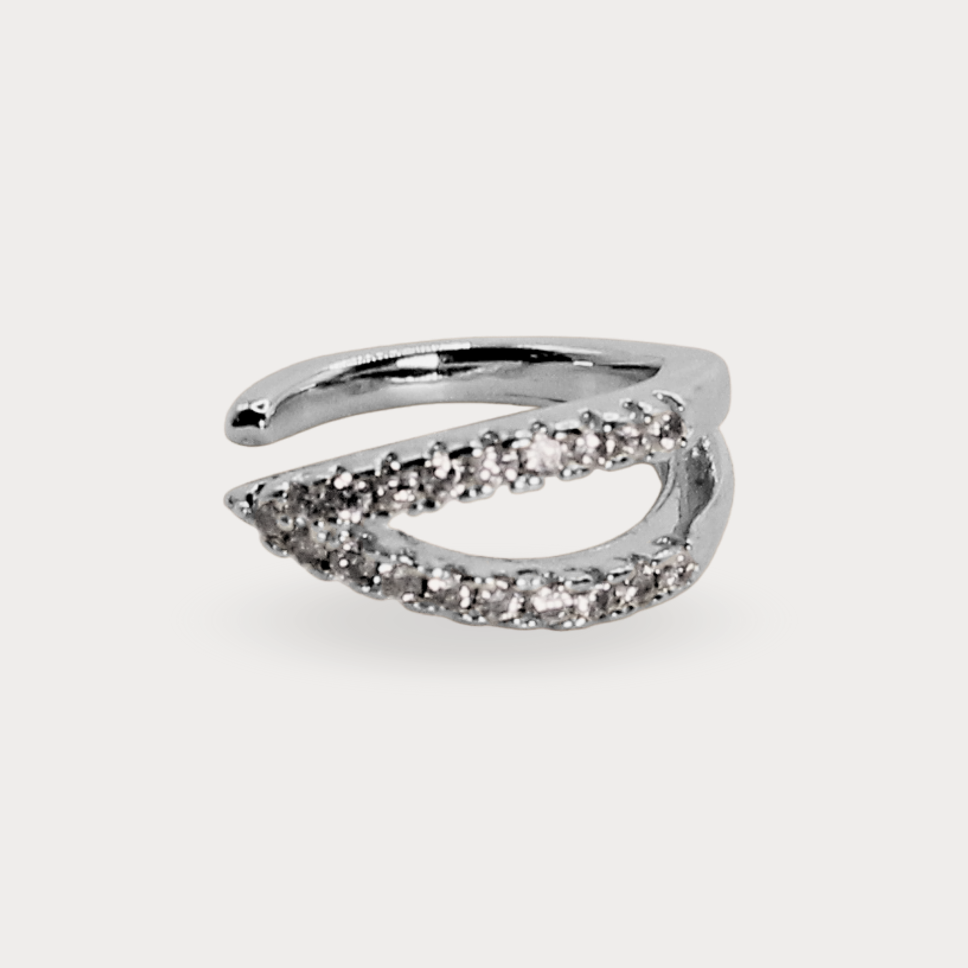 Este earcuff es una pieza sofisticada y moderna que combina diseño abierto con un toque brillante gracias a sus incrustaciones de zirconias. Disponible en baño de oro y en rodio, su forma curva doble se ajusta cómodamente a la oreja sin necesidad de perforación, aportando un look elegante y versátil.