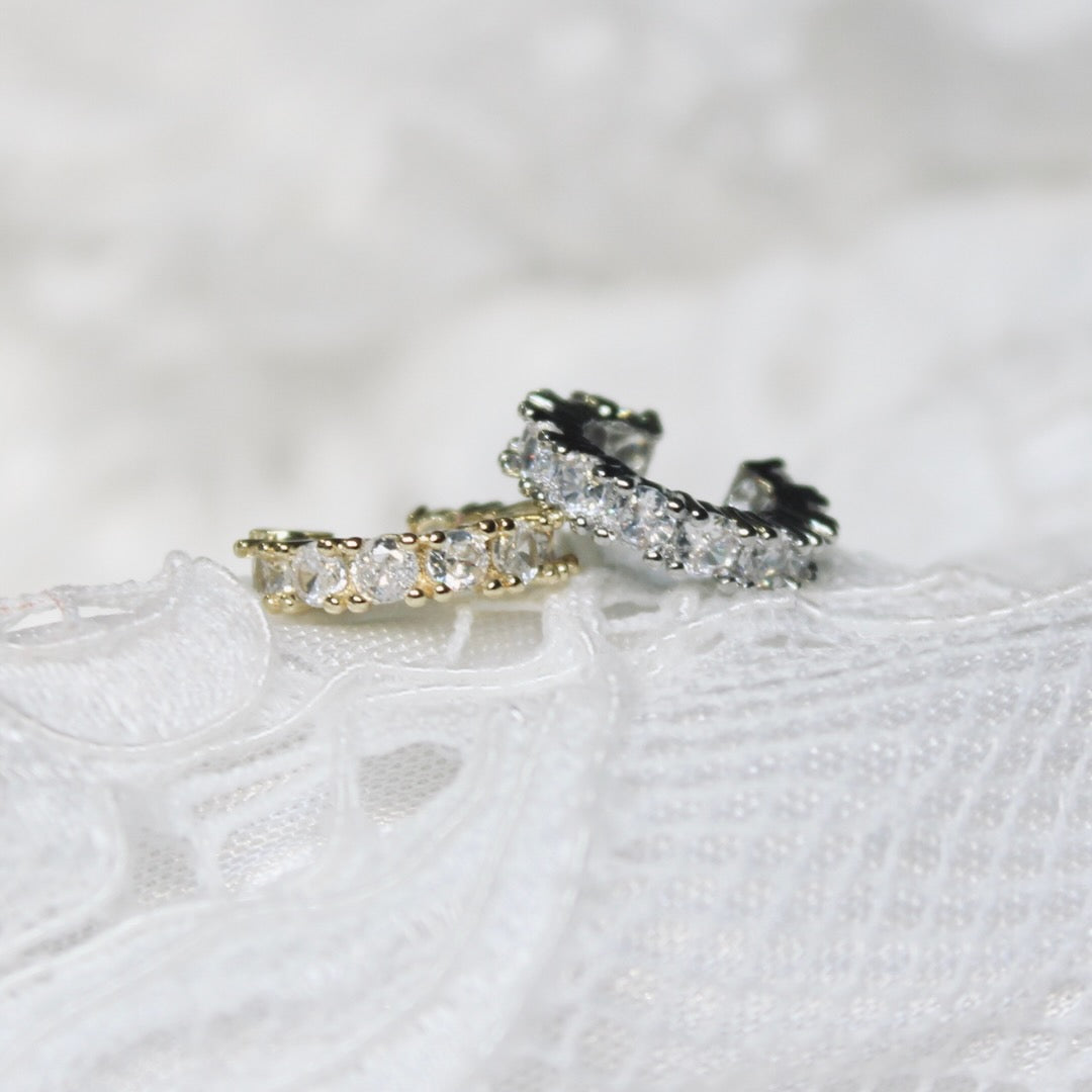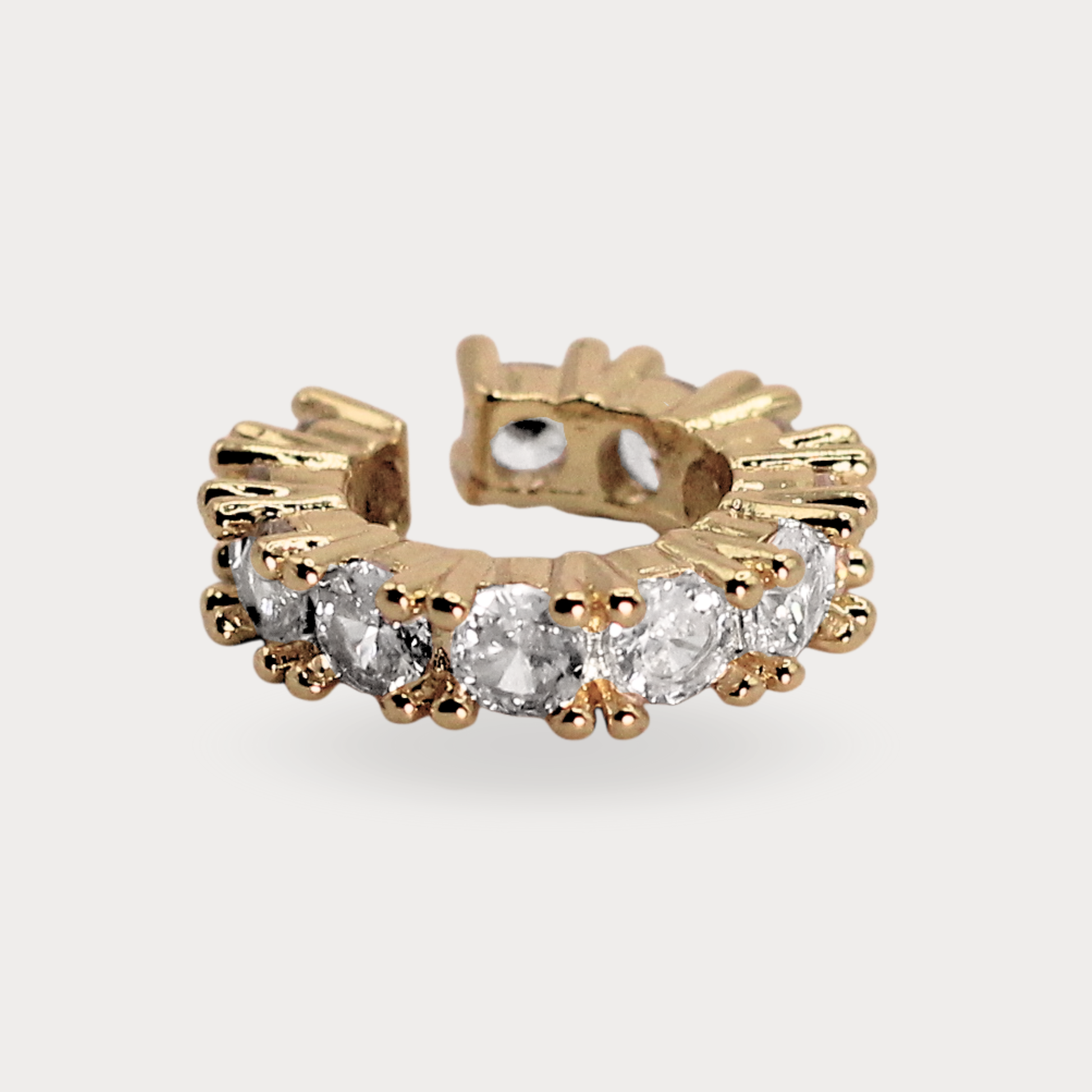 Este diseño de aro completo, adornado con brillantes piedras, te permite lucir una perforación extra con un brillo espectacular. Disponible en acabado de chapa de oro o rodio.