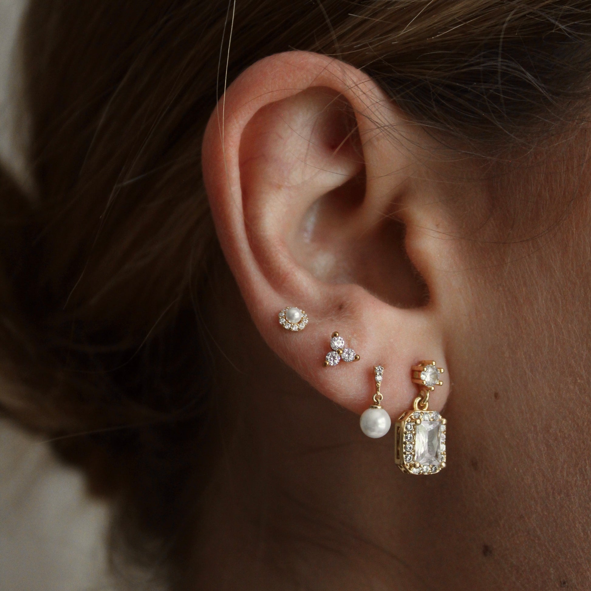 Aretes dorados con diseño colgante, incrustaciones de zirconias y piedra central rectangular tipo esmeralda. Un accesorio sofisticado que aporta brillo y elegancia a cualquier look.