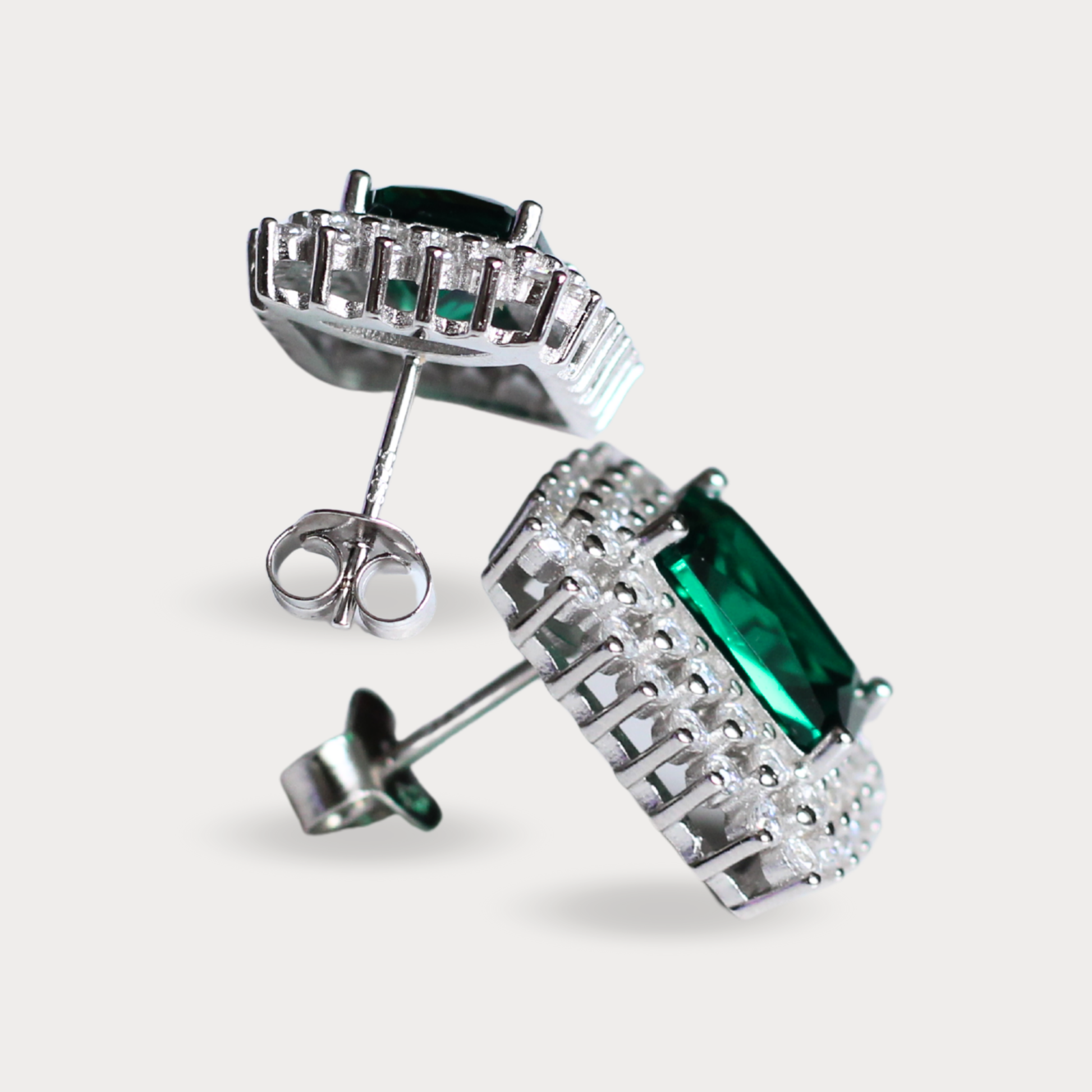 Los Aretes Stepy son el toque de color y sofisticación que tu look necesita. Cuentan con una imponente zirconia central color esmeralda de corte rectangular, enmarcada por un halo de pequeñas zirconias que añaden un brillo espectacular. Hechos de Plata