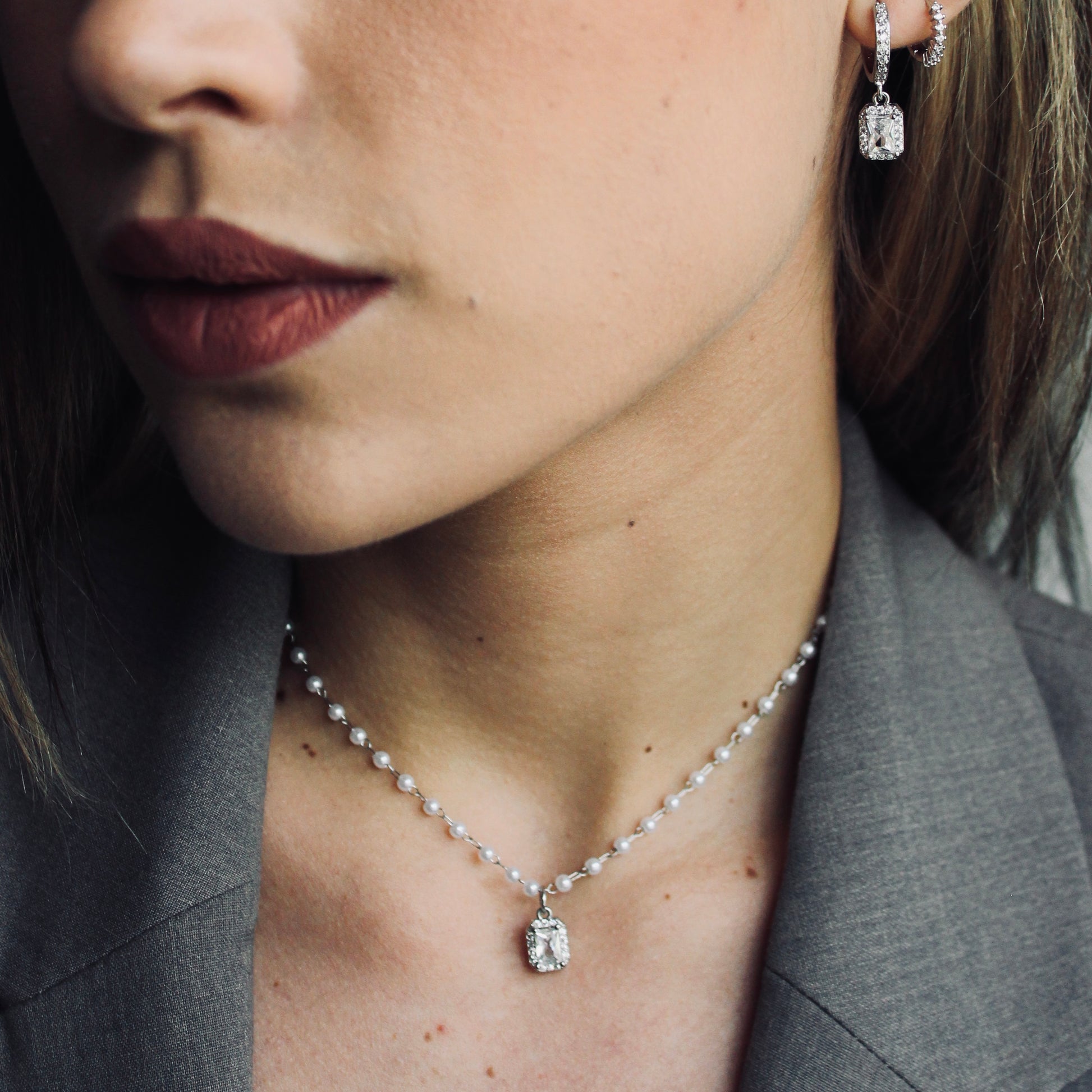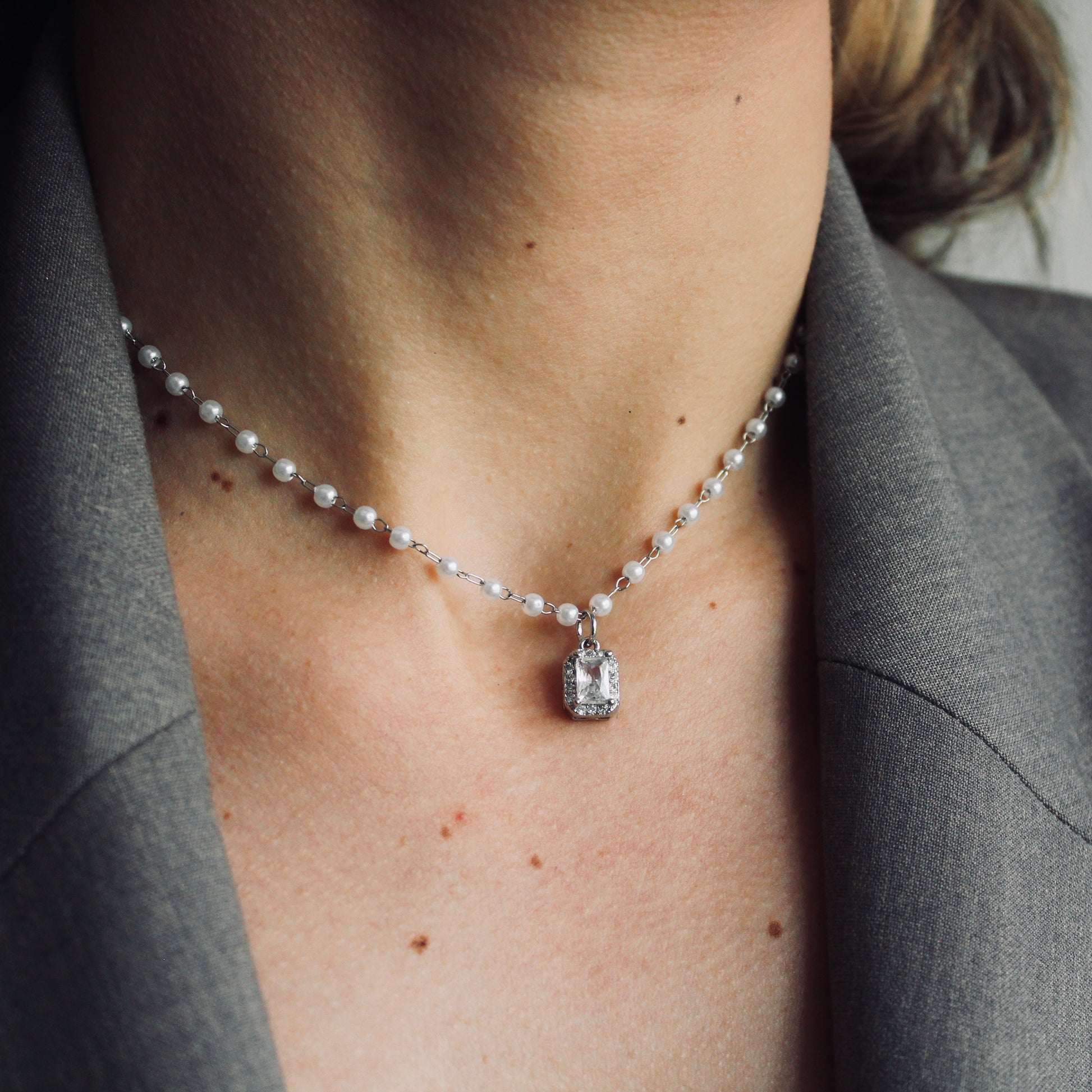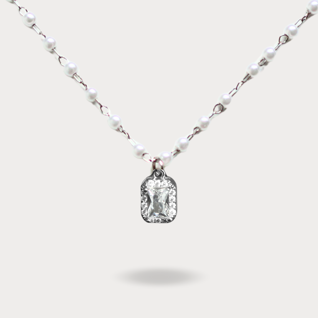 Collar plateado con cadena de perlas pequeñas y dije rectangular con incrustaciones de cristal. Un accesorio delicado y brillante, ideal para ocasiones especiales o looks elegantes.