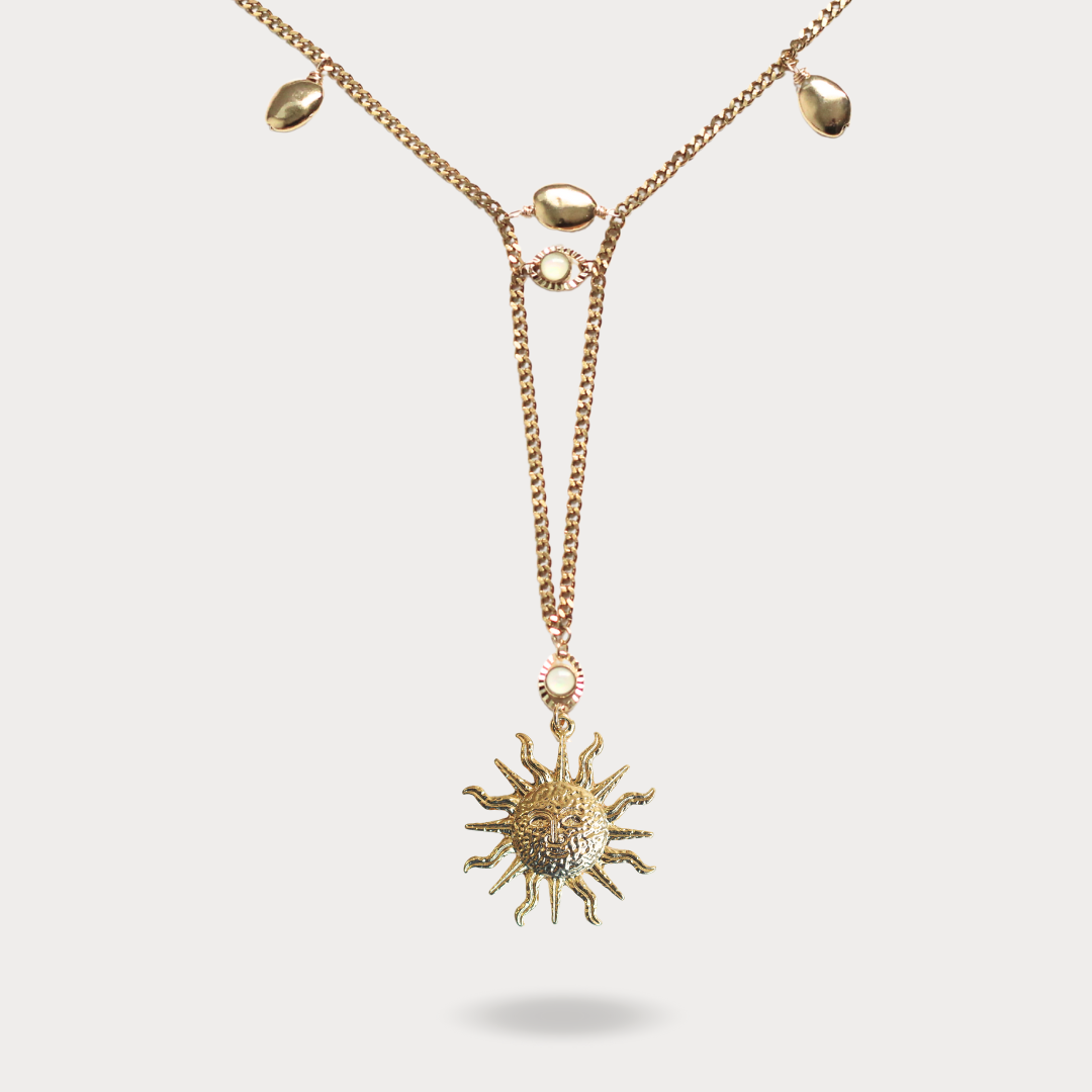 Collar dorado con dije de sol y dijes en la cadena. Un accesorio radiante que ilumina cualquier look.