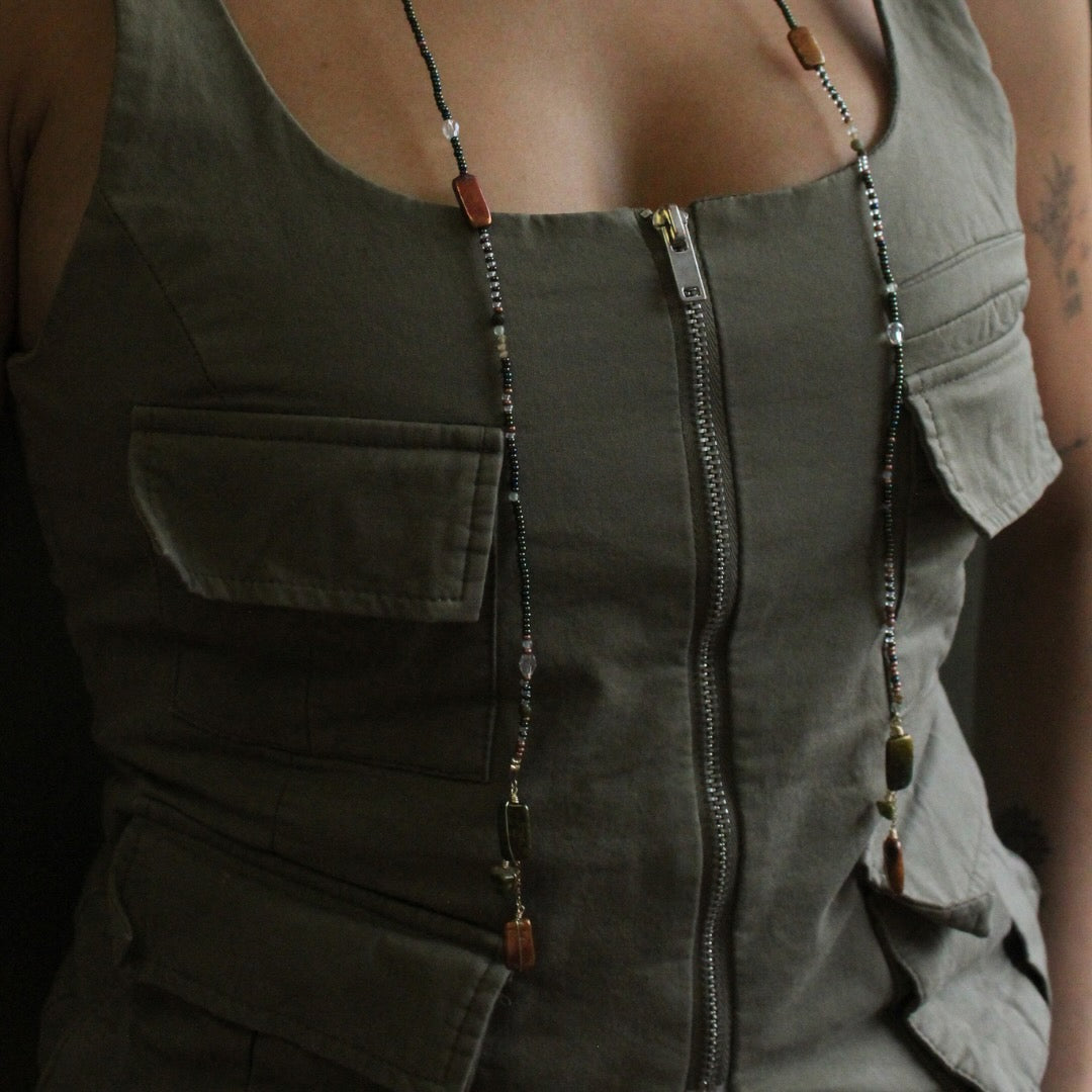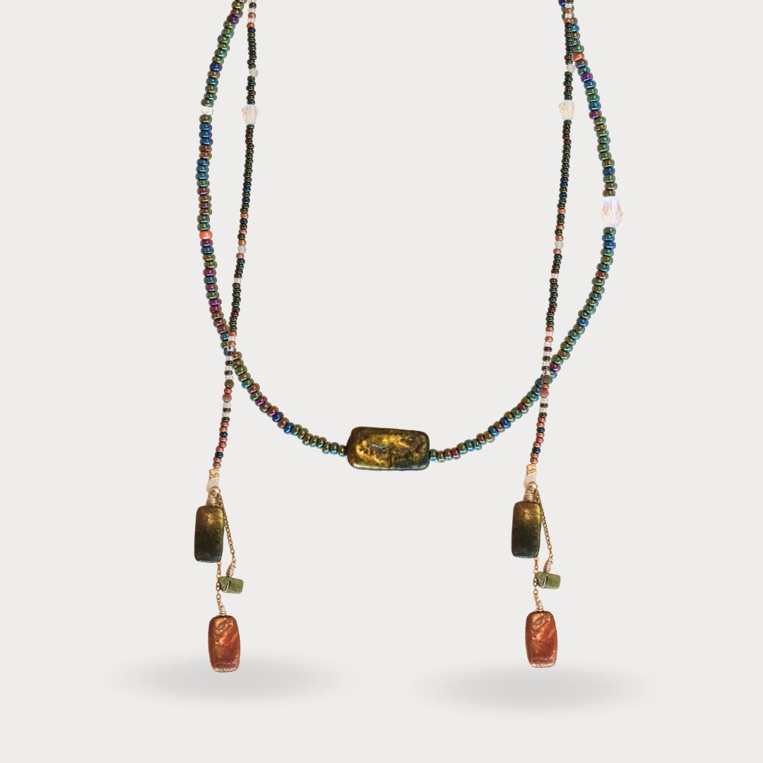 Este corbatín artesanal está elaborado por nosotros, con piedras naturales que aportan autenticidad y creatividad. Al centro destaca una perla barroca grande, de superficie iridiscente, que actúa como pieza focal.