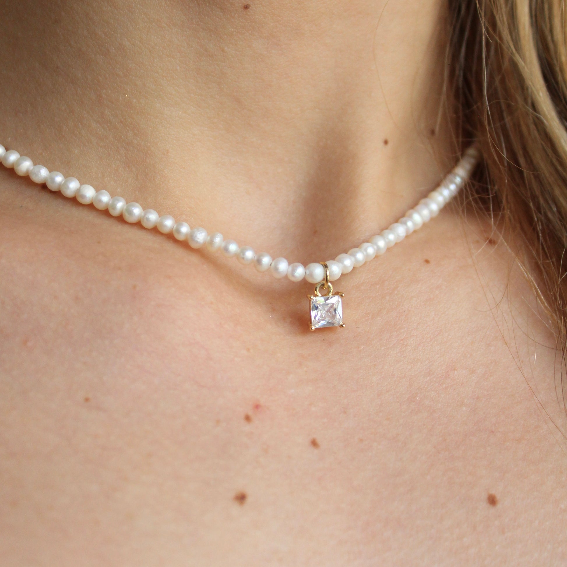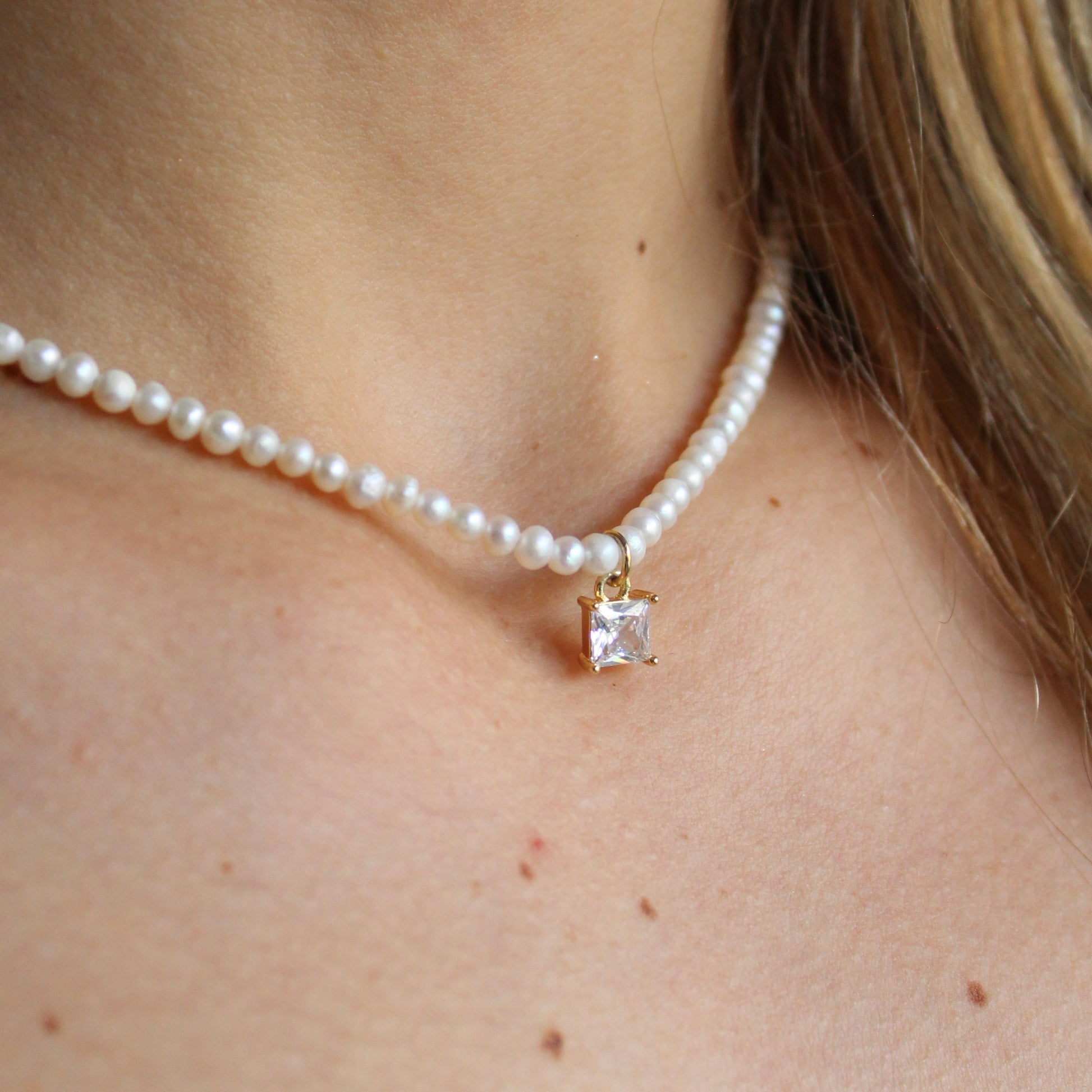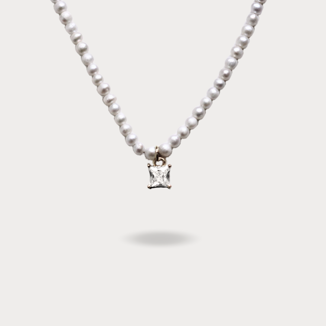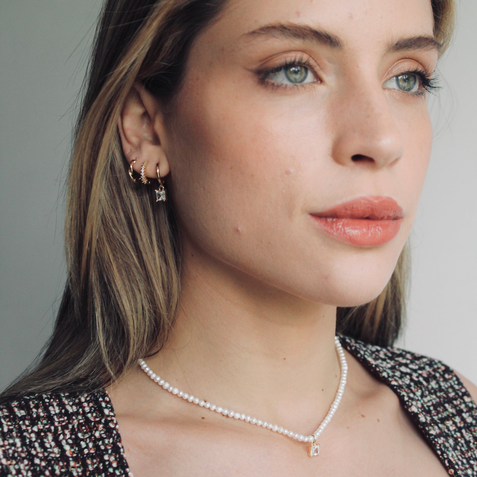 Collar de perlas con dije central de zirconia. Un accesorio clásico con un toque moderno, ideal para looks elegantes y sofisticados.