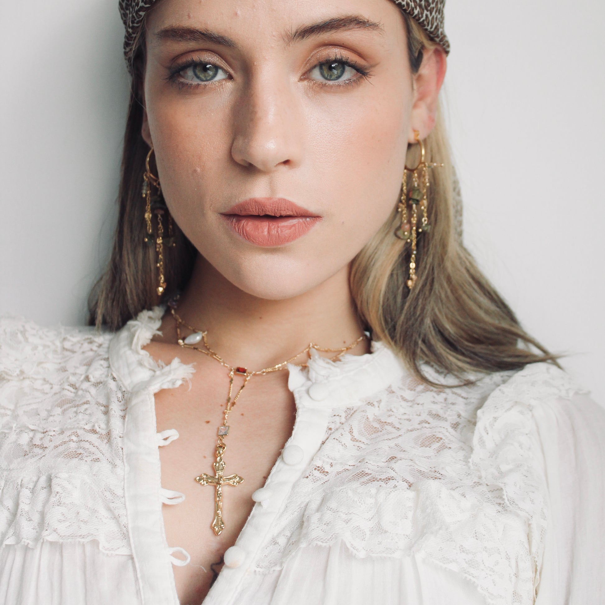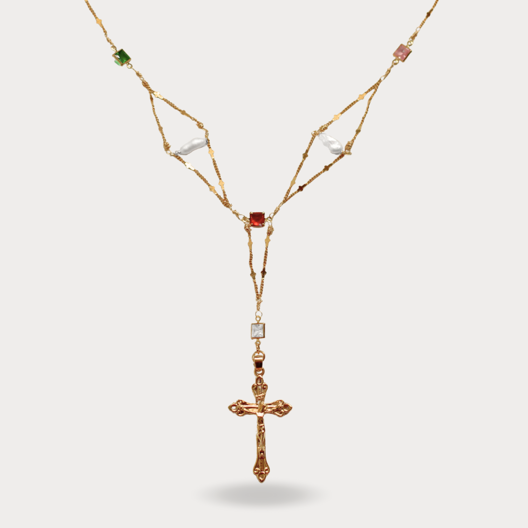 Collar dorado con cruz y piedras de colores, diseño delicado y elegante.