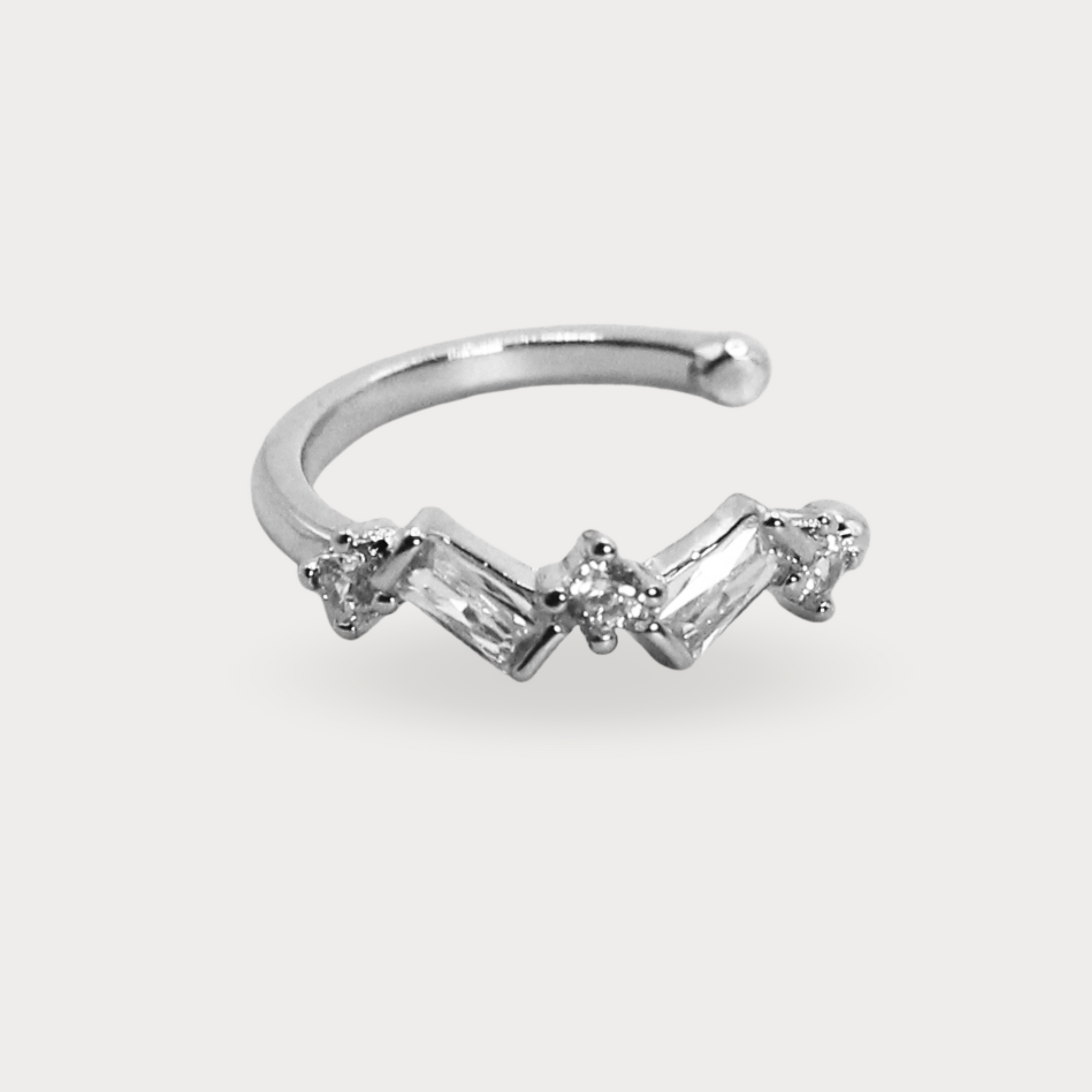 Su diseño de zigzag, adornado con zirconias de diferentes cortes, lo convierte en el accesorio perfecto para un look que busca destacar. Sin necesidad de perforación. Disponible en rodio.