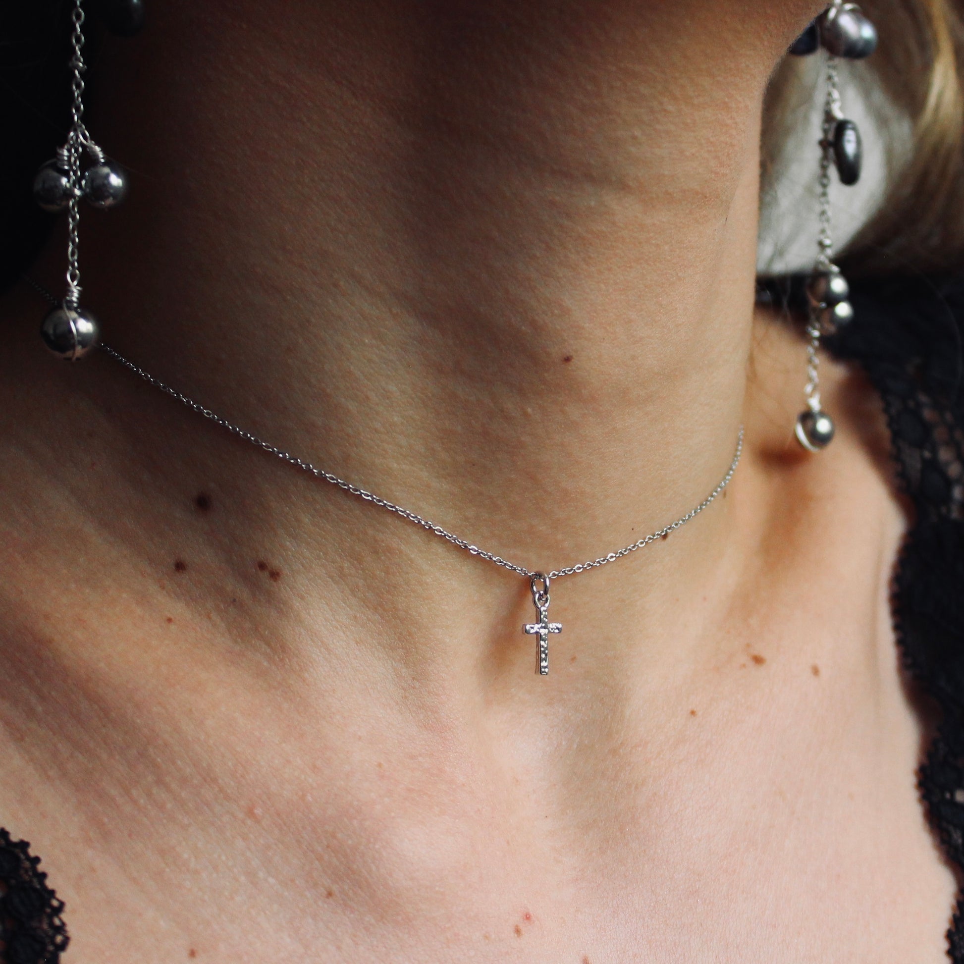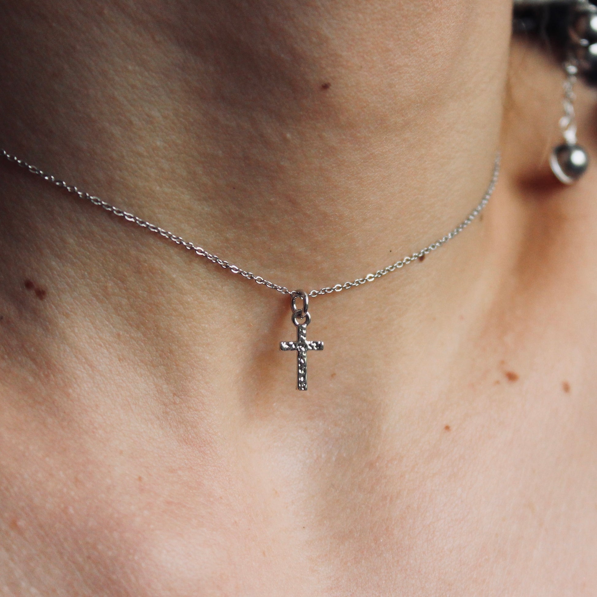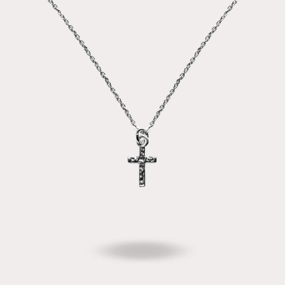 Collar plateado con una cruz texturizada que le da un toque único y especial. Minimalista pero con carácter, perfecto para usar solo o combinado con otros collares.