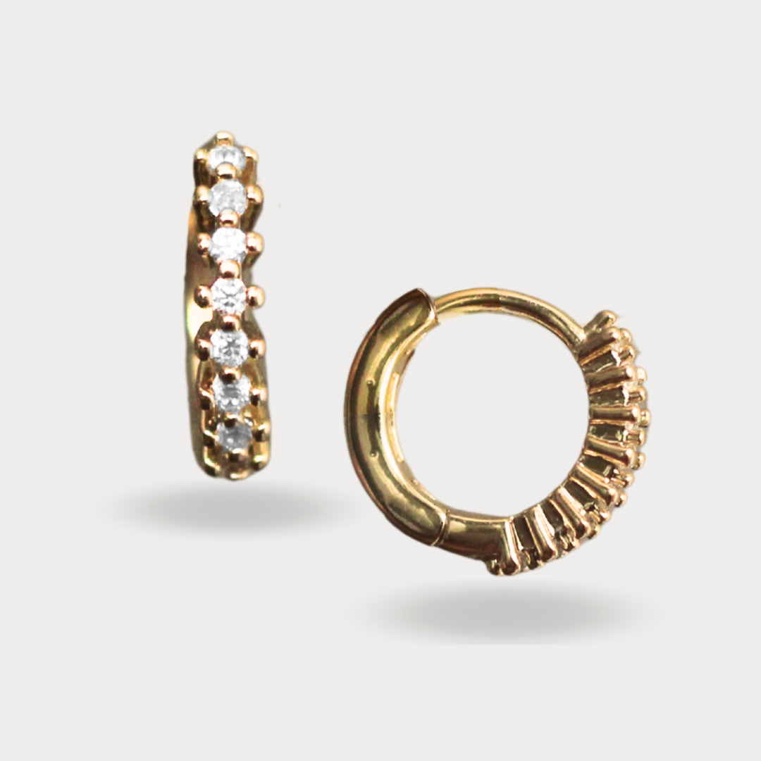 Unos huggies que serán tus favs. Con incrustaciones de zirconias sobresalientes. Un accesorio delicado, brilloso, ideal para orejas con múltiples perforaciones.