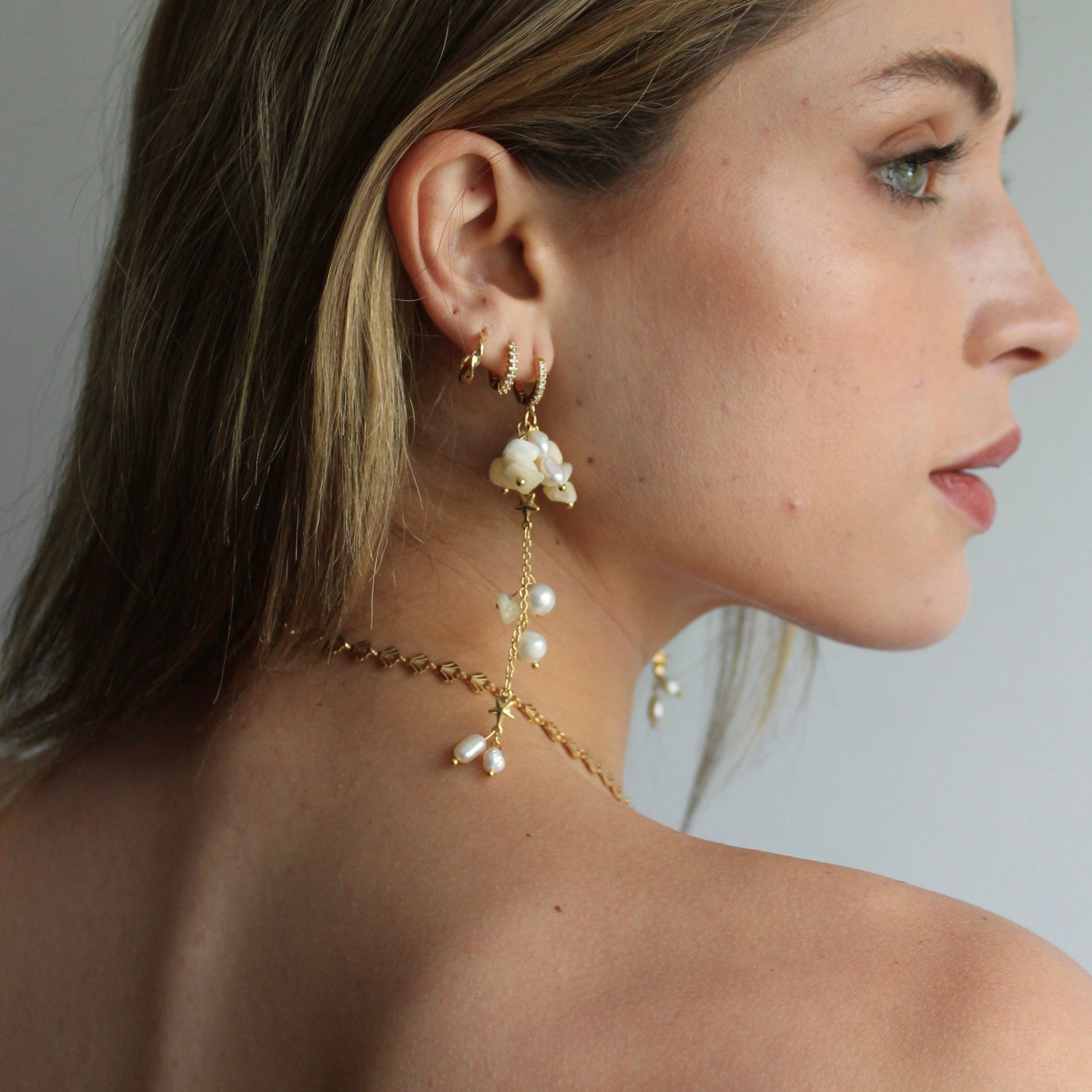 Estos aretes son una obra de arte en movimiento. Su diseño desestructurado combina perlas naturales con piedras de formas orgánicas, suspendidas en delicadas cadenas doradas que crean un efecto etéreo y elegante. Cada pieza es única, como tú, y aporta un toque bohemio chic ideal para looks sofisticados, frescos y con mucha personalidad.