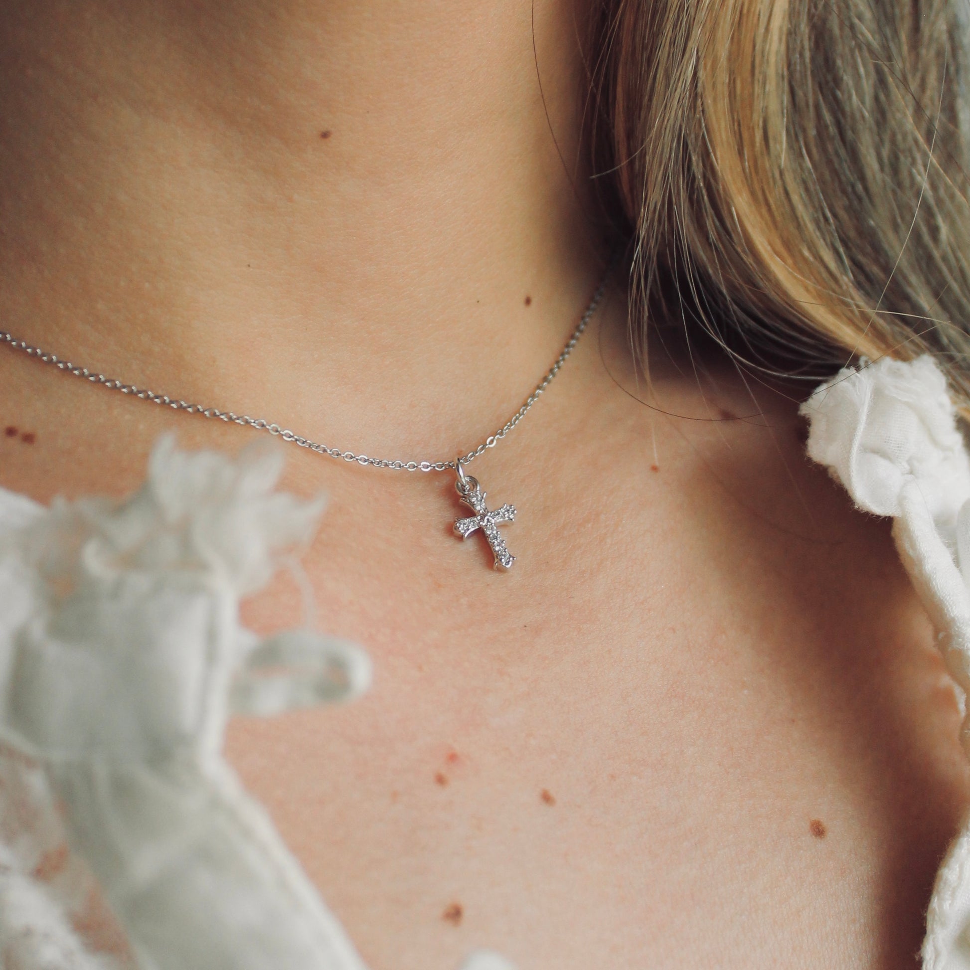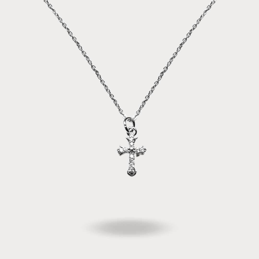 Collar plateado con una cruz de zirconias que le da un toque único y especial. Ideal para llevar todos los días (34 cm).