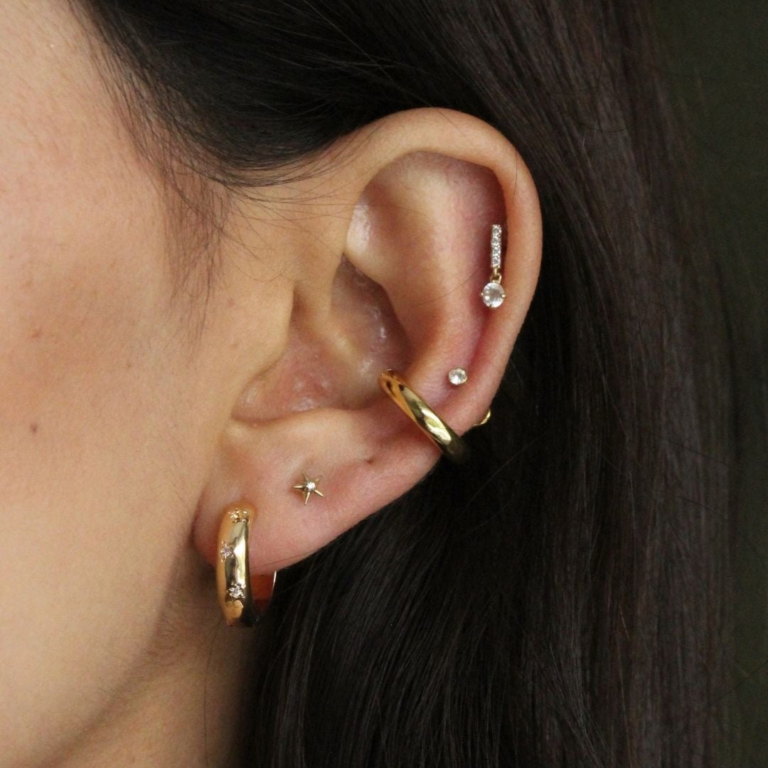 Éstos huggies dorados son elegantes y delicados, con tres brillantes zirconias que aportan un toque de luz y sofisticación. Perfectos para un estilo femenino y moderno.