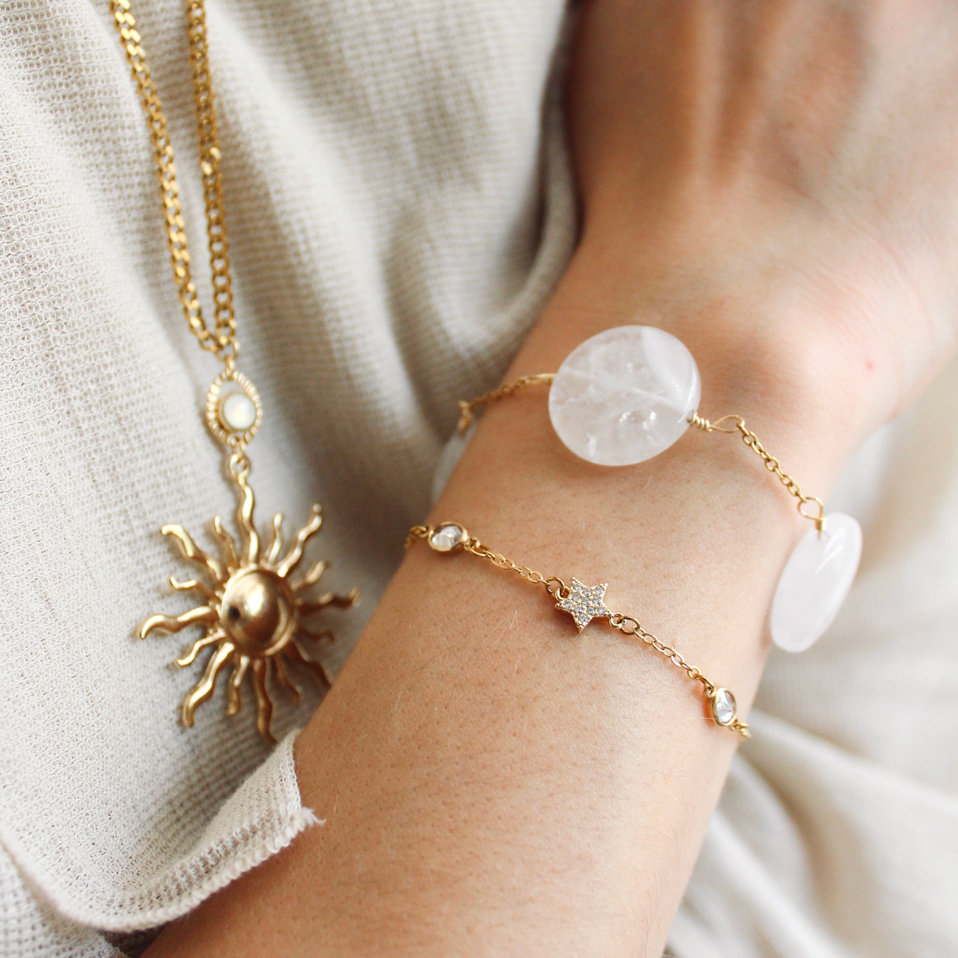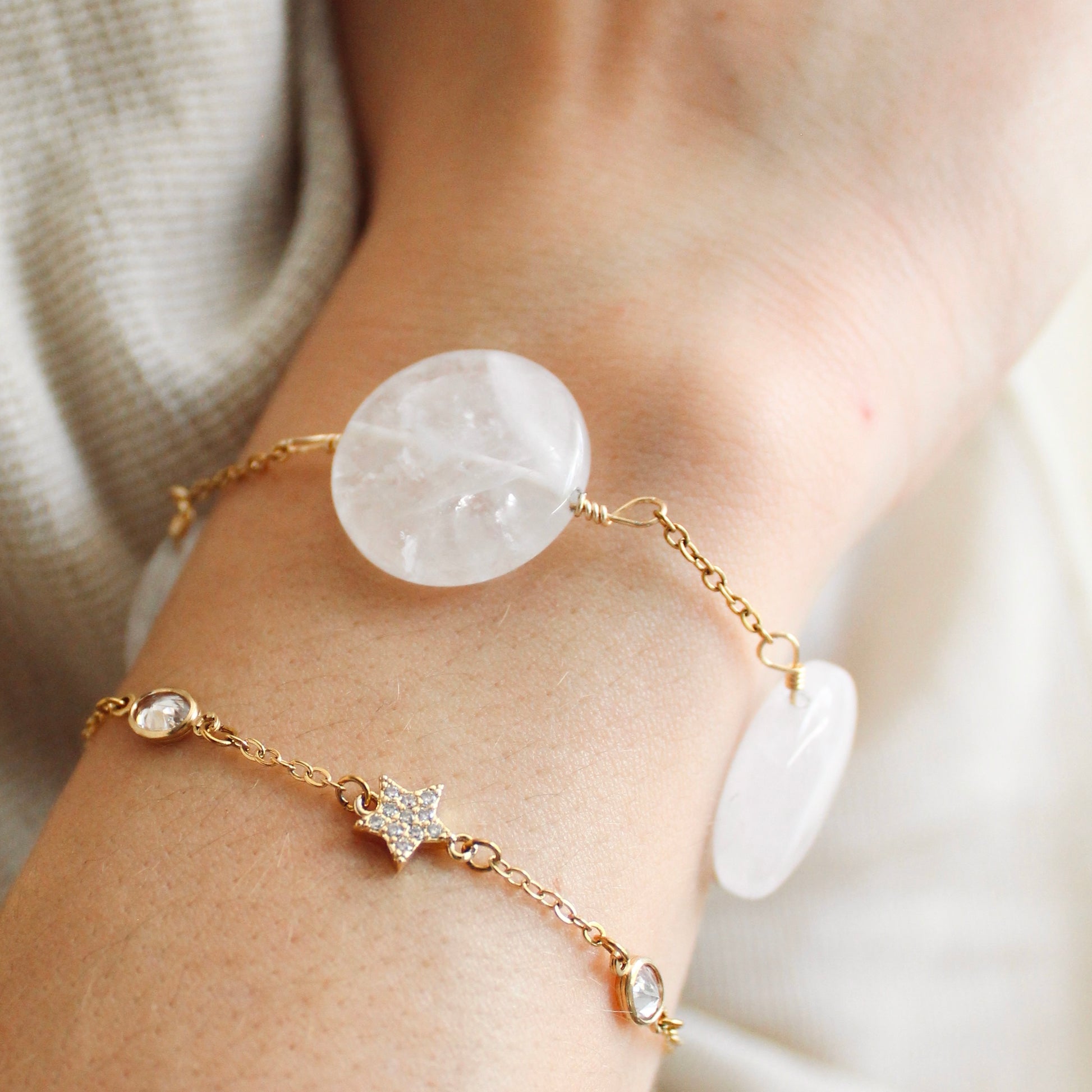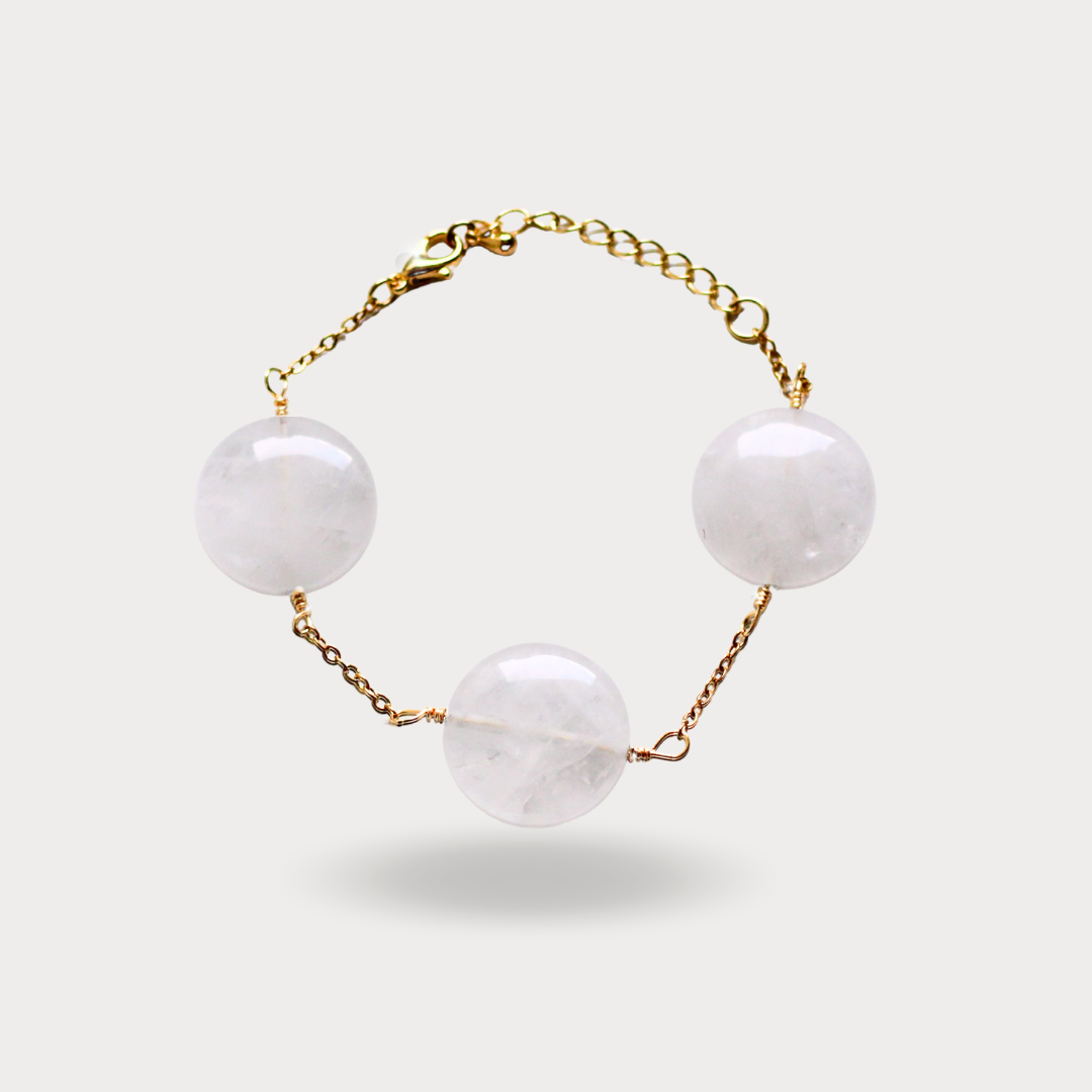 Pulsera dorada con esferas grandes de cuarzo blanco, elegante y poderosa.